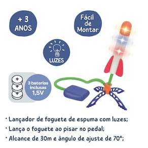 É só posicionar o foguete na base, ajustar o ângulo de lançamento até 70 e... PISAR no pedal Pronto O foguete é lançado a até 30 metros de distância, criando aquele momento de empolgação que toda criança adora.