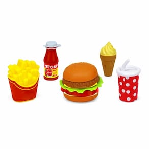 Com acessórios que imitam hamburgueres, batatas fritas, refrigerantes e muito mais, a Maleta Fast Food estimula a imaginação e o desenvolvimento social dos pequenos.