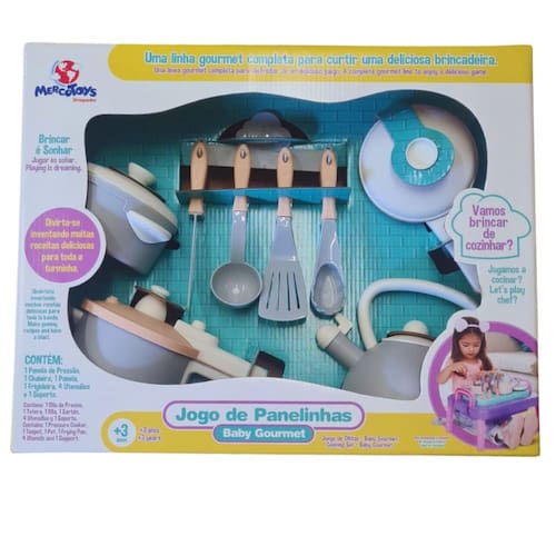 Introduza seu pequeno chef ao mundo da gastronomia com o Jogo De Panelinhas Baby Gourmet - Mercotoys. Este conjunto encantador de panelas e talheres infantis vem em uma linha gourmet completa para curtir uma deliciosa brincadeira. Foi projetado para inspirar a imaginação e promover o desenvolvimento das habilidades motoras finas. Cada peça é cuidadosamente projetada para ser segura, durável e fácil de manusear, proporcionando uma experiência educativa e divertida na hora das refeições de brincadeira.