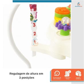- Bandeja musical removível; - Mesa de atividades equipada com brinquedos removíveis; - Assento giratório; - Possui a função jumper para a criança pular; - Regulagem de altura em 3 posições.