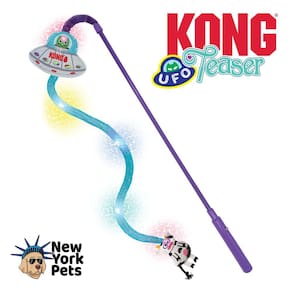 KONG Teaser UFO (objeto felino não identificado) possui luzes entre a varinha e a vaca. Aperte o botão para brilho estático, pisca-pisca ou pisca-pisca acelerado para uma aventura de outro mundo.