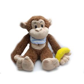 De cor MARROM, ele é macio. Ao tirar a bananinha de suas mãos, o macaquinho chora e esperneia mexendo suas pernas. De aparência agradável muito fofinha. Possui babador escrito: "Não encoste na minha comida!!!". Usa 03 três pilhas 1,5V AA. Composição: 60% poliéster, 30% polipropileno PP , 8% acrilonitrila butadieno estireno ABS , 2% cloreto de polivinila PVC .