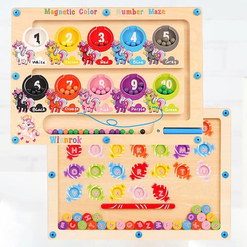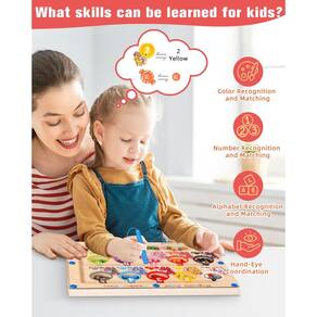 - Jogos magnéticos para crianças: o labirinto magnético tem design científico 2 em 1, um lado representa o número e a cor e o outro lado representa o alfabeto e a cor. Este jogo magnético infantil apresenta 55 contas magnéticas em 10 cores distintas. Os jogos de tabuleiro magnético de madeira permitem que as crianças aprendam 4 habilidades de número, alfabeto, contagem e correspondência de cores, mantendo-as divertidas e focadas para crianças de 3 a 5 anos