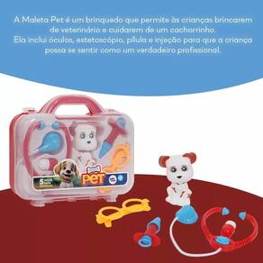 Brinquedo Maleta de Veterinário Meu Pet Paki Toys Vamos brincar de veterinário e cuidar do cachorrinho Este adorável kit permite que as crianças explorem o mundo da medicina veterinária de forma divertida e educativa. Além do pet fofinho, a maleta traz óculos, estetoscópio, pílula e injeção para a criança se sentir um verdadeiro doutor. E quando a brincadeira acabar, é só guardar tudo na maleta de plástico e carregar para onde quiser