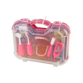 O kit inclui uma maleta para transportar os instrumentos, uma dentadura para praticar cuidados dentarios, escova e pasta de dente para incentivar habitos de higiene. Com uma pinca e um espelho, as criancas podem simular a remocao de caries, promovendo a coordenacao motora e criatividade.
