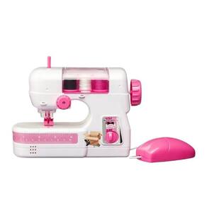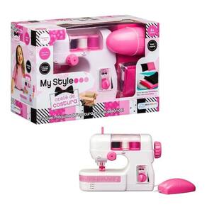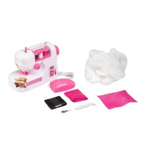 Máquina de costura de brinquedo com alça retrátil, volante, carretéis de costura, luz e pedal. Inclui tecidos, enchimento, fita métrica e linhas. Segura e projetada para crianças a partir de 7 anos.Funções