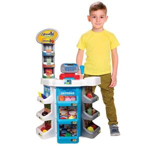 São muitos acessórios e uma registradora que faz contas de verdade Possui alimentos lúdicos para arrumar suas prateleiras do seu mercadinho do jeito que quiser Possui som na caixa registradora, deixando tudo super real Acompanha instrução de montagem e adesivos para personalizar como quiser