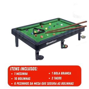 Brinquedo mesa de bilhar snooker sinuca com 2 tacos Você já pensou em como é frustrante não ter um espaço divertido e interativo em casa Sem uma mesa de bilhar, as opções de entretenimento podem se tornar limitadas, e as reuniões com amigos podem perder a graça. A mesa de bilhar portátil é a solução perfeita para transformar qualquer ambiente em uma verdadeira arena de diversão com um design prático e funcional, ela é ideal para crianças, jovens e adultos, proporcionando momentos de lazer com conforto e conveniência. Você pode usá-la em casa, em festas ou até mesmo durante viagens, sem complicações Benefícios - proporciona diversão para toda a família - estrutura leve e resistente, pronta para uso imediato - superfície de feltro verde para jogadas suaves e realistas - design compacto que se adapta a diferentes superfícies - inclui um kit completo para partidas dinâmicas Especificações técnicas - dimensões da mesa: comp.: 44cm x larg.: 25cm x alt.: 15cm - tacos: comp.: 45cm - itens inclusos: 10 bolinhas coloridas, 1 bola branca, 2 tacos, 1 triângulo organizador - registro inmetro: 009179/2024 - não recomendado para menores de 3 anos Não perca a oportunidade de criar momentos inesquecíveis com amigos e familiares adquira já a mesa de bilhar portátil e leve a diversão para onde você for Informações importantes sobre a compra - com de fábrica Dúvidas frequentes: 2 - em quanto tempo meu pedido será enviado 3 - é confiável fazer esta compra Resposta: desde a criação da nossa empresa já temos milhares de clientes satisfeitos em outras lojas online. Somos uma loja oficial neste marketplace. Além de você ter todas as garantias desta plataforma, ainda lhe oferecemos de fábrica. 4 - os produtos possuem Resposta: sim, oferecemos de 30 dias em todos nossos produtos. Caso ocorra qualquer problema iremos tratar da melhor forma para resolver o ocorrido. 5 - essa compra é segura Resposta: sim, oferecemos total segurança na sua compra bem como sigilo dos seus dados. 6 - e se eu não gostar do produto, terei meu dinheiro de volta Resposta: de acordo com o cdc código de defesa do consumidor todo cliente de compras online tem até 7 dias para devolver o produto em caso de arrependimento. E você não terá custo na devolução. Lembrando que você será reembolsado em 100% do valor da compra. Caso você tenha alguma dúvida, nos envie uma mensagem e responderemos o mais rápido possível. Homologação Inmetro: 7351/2021-BRI-9 Marca: Não Informado Ean: 7896038774302