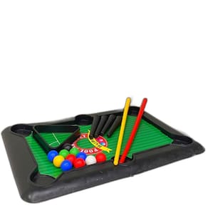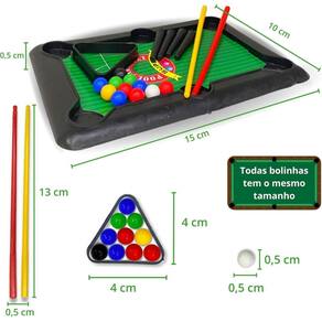 Mini bilhar de brinquedo. Funções: design compacto e portátil: o mini bilhar é projetado com tamanho reduzido, ideal para espaços menores, permitindo que seja facilmente colocado em quartos, salas de estar ou áreas de lazer. Além disso, sua portabilidade permite que as crianças o levem para onde desejarem. Materiais seguros e resistentes: o brinquedo é fabricado com materiais de qualidade e seguros, garantindo a proteção das crianças durante o jogo e a durabilidade do produto. Conjunto completo: o mini bilhar é fornecido com todas as peças necessárias para uma boa experiência de jogo Ideias de brincadeira: Mini torneio de bilhar: organize um torneio de bilhar em família ou com os amigos. Divida as crianças em times e faça um campeonato com várias rodadas. Ao final, premie as equipes vencedoras com pequenos prêmios ou certificados. Bilhar de pontuação crescente: cada vez que uma criança acerta uma bola na caçapa, ela ganha pontos. A cada acerto, a avaliação aumenta, e a criança que consegue acumular mais pontos ao longo do jogo é a vencedora.