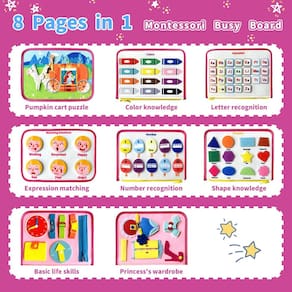 Prancha ocupada 8 em 1 para crianças, essencial para viagens domésticas da criança. Razões para nos escolher. Várias atividades, muito adequadas para manter bebês, crianças pequenas ou crianças ocupadas. Todas as crianças pequenas vão adorar brincar, o que pode manter seu bebê quieto, liberar seu tempo e dar a você tempo para fazer suas próprias coisas. Diferentes habilidades de atividade para exercitar as várias habilidades básicas do seu filho. Em comparação com outros tabuleiros ocupados, oferecemos uma variedade de atividades que podem ajudar seu filho a desenvolver suas habilidades práticas, pensamento, coordenação mão-pé, cognitivas e independentes enquanto brinca. Ele alcança muitas coisas de uma só vez. Placa de feltro não tóxica e macia, leve e fácil de transportar em comparação com outras placas de madeira, nosso produto é feito de materiais não tóxicos e macios, permitindo que seu filho o use com confiança, cresça com segurança e não se preocupe em ser derrubado ou atingido durante o uso. Nosso brinquedo Montessori infantil é fácil de transportar, seja em viagens rodoviárias ou viagens de avião, mantendo seu filho quieto durante a viagem. É o melhor brinquedo de viagem. O melhor presente para pré-escolares e crianças na educação pré-escolar. Deixe as crianças aprenderem brincando e superando facilmente seus pares. Feito de materiais de alta qualidade que atendem aos rigorosos padrões internacionais de segurança - ?Quadro ocupado para crianças?Nosso quadro ocupado para crianças pequenas tem 8 páginas para brincar e mais de 18 atividades para manter seu pequeno ocupado por horas. Placas sensoriais podem simular cenários básicos da vida real, ajudando seu filho a desenvolver habilidades básicas e interesses em exploração e brincadeira. - ?Aprendendo através da brincadeira?Nosso quadro Montessori Busy foi projetado de acordo com o conceito de educação infantil, ajudando as crianças a aprender habilidades para a vida e desenvolver atividades de aprendizagem na primeira infância, incluindo fivelas, zíperes, relógios, direções, roupas, quebra-cabeças, letras, expressões, cores, formas, números, etc - ?Seguro e durável? Nosso livro ocupado para crianças é feito de tecido de feltro macio, não tóxico, macio, sem bordas afiadas, e todos os componentes são firmemente fixos, permitindo que seus filhos brinquem com tranquilidade. - ?Essenciais de viagem para crianças?Este livro ocupado tem uma alça que pode ser desmontada em páginas separadas, facilitando o transporte das crianças durante a viagem. Este brinquedo educativo mantém as crianças pequenas quietas durante viagens chatas, longe das telas enquanto também desenvolve habilidades, tornando-o o brinquedo de viagem perfeito. - ?Ótimo presente para crianças?Presentes cuidadosamente trabalhados de alta qualidade com lindos padrões de princesa na capa e design nas costas, sua linda princesinha definitivamente vai adorar. Esta combinação de brinquedos educativos e de viagem infantil é um presente criativo e prático para vários feriados, como Natal, Ano Novo, Halloween, Páscoa e Ação de Graças.