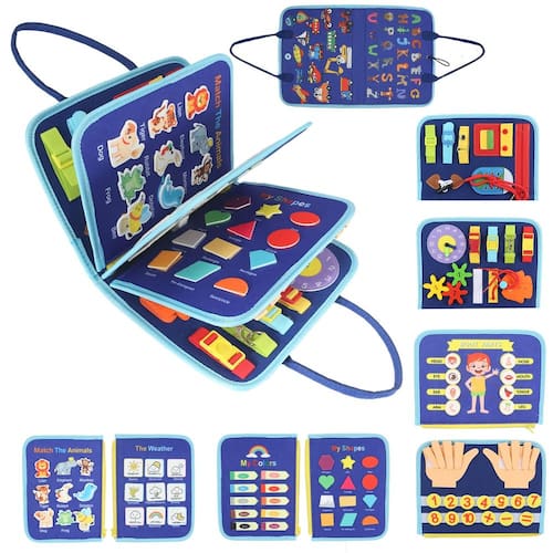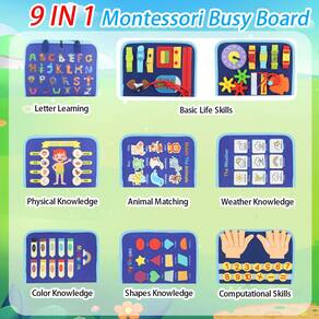 Prancha ocupada 9 em 1, essencial para viagens domésticas da criança. Razões para nos escolher. Várias atividades, muito adequadas para manter bebês, crianças pequenas ou crianças ocupadas. Todas as crianças pequenas vão adorar brincar, o que pode manter seu bebê quieto, liberar seu tempo e dar a você tempo para fazer suas próprias coisas. Diferentes habilidades de atividade para exercitar as várias habilidades básicas do seu filho. Em comparação com outros tabuleiros ocupados, oferecemos uma variedade de atividades que podem ajudar seu filho a desenvolver suas habilidades práticas, pensamento, coordenação mão-pé, cognitivas e independentes enquanto brinca. Ele alcança muitas coisas de uma só vez. Placa de feltro não tóxica e macia, leve e fácil de transportar em comparação com outras placas de madeira, nosso produto é feito de materiais não tóxicos e macios, permitindo que seu filho o use com confiança, cresça com segurança e não se preocupe em ser derrubado ou atingido durante o uso. Nosso brinquedo Montessori infantil é fácil de transportar, seja em viagens rodoviárias ou viagens de avião, mantendo seu filho quieto durante a viagem. É o melhor brinquedo de viagem. O melhor presente para pré-escolares e crianças na educação pré-escolar. Deixe as crianças aprenderem brincando e superando facilmente seus pares. Feito de materiais de alta qualidade que atendem aos rigorosos padrões internacionais de segurança - ?Quadro ocupado para crianças?Nosso quadro ocupado para crianças pequenas tem 9 páginas para brincar e mais de 20 atividades para manter seu pequeno ocupado por horas. Placas sensoriais podem simular cenários básicos da vida real, ajudando seu filho a desenvolver habilidades básicas e interesses em exploração e brincadeira. - ?Aprendendo através da brincadeira?Nosso quadro Montessori Busy é projetado com base no conceito de educação infantil, ajudando as crianças a aprender habilidades de vida e desenvolver atividades de aprendizagem na primeira infância, incluindo fivelas, zíperes, cadarços, engrenagens, relógios, letras, partes do corpo, animais, clima, cores, formas, aritmética, etc - ?Seguro e durável? Nosso livro ocupado para crianças é feito de tecido de feltro macio, não tóxico, macio, sem bordas afiadas, e todos os componentes são firmemente fixos, permitindo que seus filhos brinquem com tranquilidade. - ?Essenciais de viagem para crianças?Este livro ocupado tem uma alça que pode ser desmontada em páginas separadas, facilitando o transporte das crianças durante a viagem. Este brinquedo educativo mantém as crianças pequenas quietas durante viagens chatas, longe das telas enquanto também desenvolve habilidades, tornando-o o brinquedo de viagem perfeito. - ?Ótimo presente para crianças?Presentes cuidadosamente trabalhados de alta qualidade com padrões de transporte interessantes no design da capa, meninos e meninas vão adorar. Esta combinação de brinquedos educativos e de viagem infantil é um presente criativo e prático para vários feriados, como Natal, Ano Novo, Halloween, Páscoa e Ação de Graças