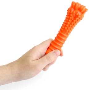 O mordedor é grande, para poder estimular seu cachorro a praticar a mordida lateral e não a mordida de cima para baixo, assim auxilia na formação dentária do seu pet.