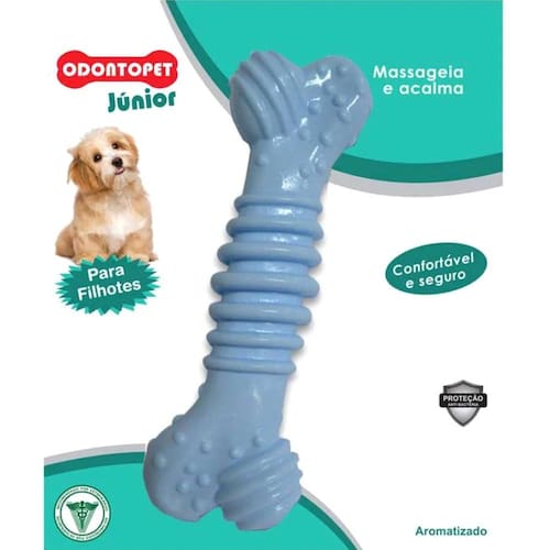 Características: - Odontopet Júnior ajuda o filhote a desenvolver hábitos saudáveis de mastigação, inibindo a mastigação destrutiva. - Seguro. higiênico e confortável. - Com proteção antibacteriana, com ação contínua pelas 24 horas do dia, durante a vida útil do produto.- - Entretém por longo tempo, sem riscos. - Seu material é macio, massageando e reduzindo o tártaro. - Tamanho, peso e design apropriados para filhotes, antes da dentição permanente. - Não é indicado para cães adultos ou filhotes com dentição permanente. - Recomendado pelos veterinários.