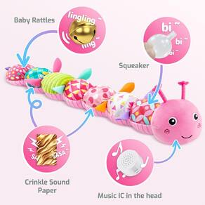 - DESENVOLVIMENTO AUDITIVO - A linda lagarta musical pode emitir 4 sons diferentes: 1x caixa de música (com uma música) na cabeça; 1x BB guinchos, 2x papel sonoro enrugado na parte traseira; 1 x chocalhos na cauda. O bebê pode explorar a alegria de vários sons dele.