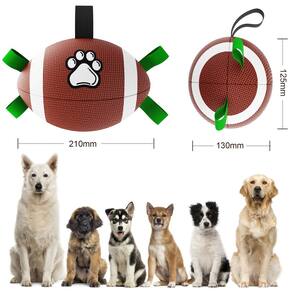 - Para cães pequenos e médios — este brinquedo de bola para cães tem 20 cm de diâmetro e uma pele de borracha pesada protege a bexiga de ar, permitindo que ela seja chutada e quicada como um futebol, mas com maior durabilidade. Não é para mastigadores agressivos, também não deve ser utilizado como um brinquedo para mastigar. Sempre supervisione seu animal de estimação enquanto brinca.