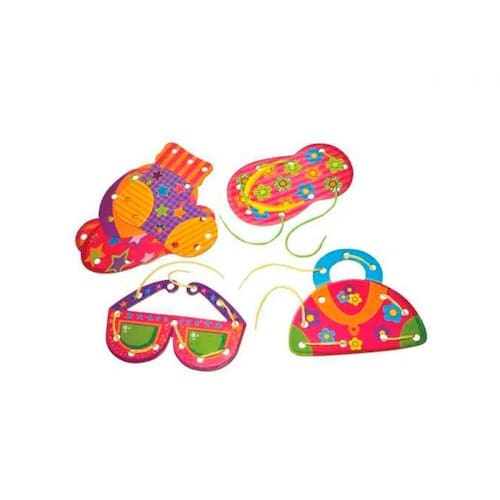Conjunto confeccionado em MDF, impresso em cores, contendo 06 peças com formatos diferentes perfuradas, e 06 cadarços coloridos. Acondicionado em caixa de madeira.