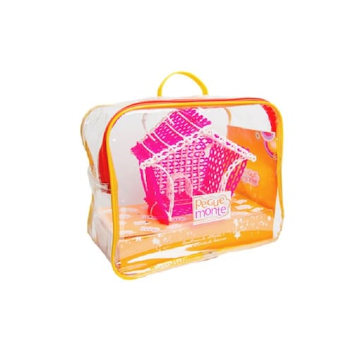 Maleta plástica Pegue e Monte contendo 500 Pegs Palitos plásticos flexíveis e atóxicos em sete cores com 8 orifícios e 9 encaixes externos mais uma Casinha montada com aproximadamente 50 pegs, e manual colorido com informações e passo a passos, que permitem às crianças, jovens e adultos montarem desde simples formas e figuras até os mais complexos objetos, como aviões, navios, barcos, casinhas, helicópteros, carrinhos...