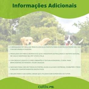* Tipo: Brinquedo pet / Bola de tênis para cães * Material: Fibra Química e Borracha * Quantidade: 2 unidades * Cores: Verde e Amarelo / Vermelho e Amarelo * Função: Entretenimento, estímulo físico e mental * Indicação: Cães de todos os portes * Validade: Indeterminada