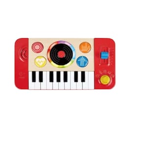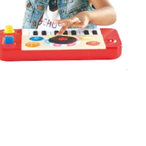 Ajude seus pequenos a tocar suas primeiras músicas com este estúdio de DJ portátil! Toque o solo do teclado girando o botão para selecionar um dos quatro sons de instrumentos ou 18 efeitos sonoros divertidos. Então, quando estiver pronto, você pode pressionar o botão no meio para selecionar uma das cinco músicas de fundo e usar o controle deslizante de tempo para alterar a velocidade, adicionar efeitos sonoros de DJ e fazer scratch junto com o disco preto! Quando você estiver se sentindo mais confiante, selecione o instrumento, o andamento e os efeitos certos e crie seu próprio mix! Perfeito para incentivar a criatividade e o amor pela música eletrônica.