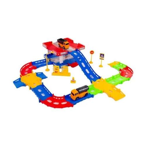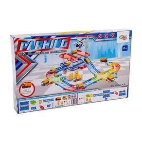 O conjunto conta com 36 peças, incluindo rampas, elevadores, acessos, sinalizações de trânsito e uma estrutura de estacionamento com múltiplos níveis, proporcionando um ambiente realista para a brincadeira.