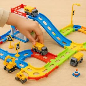 As peças são de fácil encaixe, permitindo uma montagem intuitiva e estimulando a coordenação motora e o raciocínio lógico durante a construção do cenário, a pista pode ser montada e desmontada rapidamente, facilitando o transporte e o armazenamento.
