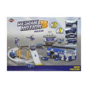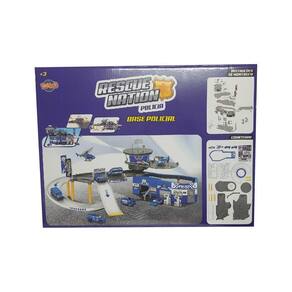 Atenção, todas as unidades se dirijam para a área de diversão garantida. Dispensados O super kit base policial da Rescue Nation possui três veículos e um helicóptero, além de uma super base policial, com um andar superior e heliporto para o helicóptero. Patrulhe a cidade dos seus brinquedos com a Rescue Nation da Toyng. Imagens meramente ilustrativas.