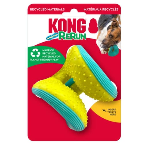 Kong Rerun Whoosh é um brinquedo feito para segurar petiscos e que ajuda a limpar os dentes e gengivas. Possui um apito que mais lembra uma ventania, mais silencioso para não perturbar os papais. O som sibilante único desperta os instintos naturais dos cães, enquanto o salto errático do brinquedo alimenta a diversão.Perfeito pra ser jogado em brincadeiras de jogar e trazer. Formato único para que ser mais fácil de agarrar. Feito de 51% de material reciclado para uma brincadeira amiga do planeta.Importante: Não é um objeto de roer. Não deve ser deixado sozinho com o cão nem por alguns minutos, até ter certeza de que o cão não irá destruí-lo.Destinado à cães com mordidas leves. Para cães com mordida forte e destruidores, prefira os brinquedos de borracha natural. Acabada a brincadeira, guarde para a próxima.Composição: Plastico e apitoIndicado para cães de Porte Pequeno e MédioMedidas Aproximadas: 9,5 x 8,5 cm