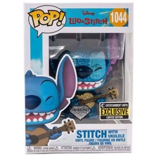 Apresentando o Brinquedo Stitch que Brilha com Decoração de Glitter de Diamante e Figura Colecionável Ukulele Diamond Glitter, produzido pela Funko. Esta figura exclusiva da Disney Lilo & Stitch, Stitch com Ukulele Diamond Glitter POP Figura 1044, é um item imperdível disponível apenas na Entertainment Earth.
