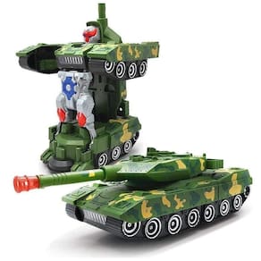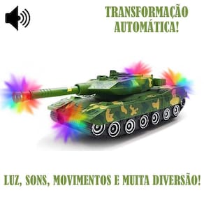 Tanque de Combate Militar de Transformação Automático Bateria Operada 2-em-1 transformar tanque para robô e novamente robô para tanque com luzes brilhantes e som. É um brinquedo operado por Pilhas 3 AA. O brinquedo emite luzes brilhantes com música. Quando o mesmo bate em algum local ele retorna para trás e continua a apresentação.