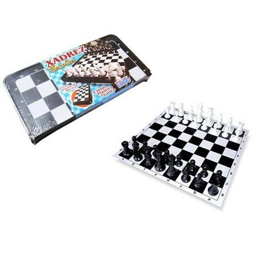 Brinquedo Xadrez com estojo prático dobrável e peças maciças de plástico.