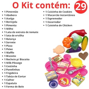 Kit comidinhas legumes + cestinha c/ panelinhas infantil com 29 peças.Nosso Kit é composto por 29 peças, com diversos acessórios para seus filhos brincarem como grandes chefes de cozinha e soltar a imaginação na hora de criar pratos deliciosos.Esse é um brinquedo lúdico que trabalha a imaginação e a criatividade dos seus filhos, para brincarem sozinhos ou se divertirem com a turminha.Idade Recomendada: A partir de 3 anosO kit contém:- 1 Pimentão- 1 Abobora- 1 Acelga- 1 Berinjela- 1 Pimenta- 1 Milho- 1 lata de extrato de tomate- 1 lata de ervilhas - 1 Balança- 1 Sorvete- 1 Pizza- 1 Peixe- 1 Waffe- 1 Biscoito- 1 Recheio Biscoito- 1 Milk Pêssego- 1 Cestinha- 2 Panelinhas- 1 Frigideira- 1 Tabúa de Cortar- 1 Colher- 1 Espatula- 1 Forma de Bolo- 1 Caixinha de Cookies- 1 Macarrão Instantâneo- 1 Espremedor- 1 Escorredor- 1 Caixinha Chicken
