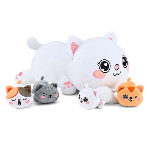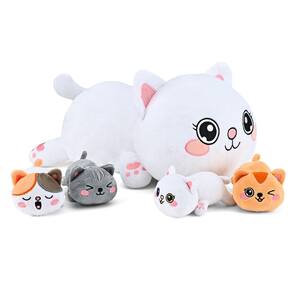 Conjunto de brinquedos de pelúcia macios para bebês, crianças pequenas, meninas e crianças — Conjunto de brinquedos de pelúcia: há 4 gatinhos fofos na barriga da mamãe, abra o zíper e você verá, que surpresa! Os meninos e meninas os amam absolutamente e mal podem esperar para abraçá-los e brincar com eles. Este conjunto de brinquedos de pelúcia vem em uma caixa de presente delicada, perfeita para um presente para crianças de 3 a 4, 5, 6, 7, 8 anos. - Design adequado para crianças: todos os gatinhos são feitos dos tecidos mais confortáveis e macios. Esses brinquedos de pelúcia são preenchidos com material macio de algodão PP na cabeça, torso e pés, muito macios ao toque. Essas bonecas de pelúcia são adequadas para festas de chá ou histórias e são ótimas para abraçar e brincar. - Brinquedos fofos de bichos de pelúcia: o design exclusivo e engenhoso inclui olhos e nariz vívidos, desenhos de expressão fofos e engraçados formam as diferentes características de cada gatinho. O corpo da mamãe é branco, 4 bebês são cinza, laranja, de cor mista e branco, cores diferentes são convenientes para criar papéis diferentes para as crianças. Brinquedo de companhia muito divertido para nossos filhos. - Fácil de armazenar e transportar: a mamãe tem cerca de 13 pol/33 cm, os gatinhos têm cerca de: 3,5 pol/12 cm; a estrutura compacta da embalagem e o peso leve tornam mais conveniente levá-los para qualquer lugar. Coloque-os em mochilas e malas escolares, adequadas para muitas ocasiões, aviões, carros, restaurantes, etc. Ofereça uma ótima oportunidade de brincar, interagir e se comunicar com seu filho, compartilhar uns com os outros. - Melhor ideia de presente: ideia de presente de aniversário de Natal e todos os tipos de presente do festival (Páscoa, Natal, sacola de presentes de Halloween, presentes de guloseimas ou doces, Ação de Graças, Ano Novo). Brinquedos adequados para bebês e crianças de 3 a 7 e 4 a 8 anos. Presentes atenciosos colocarão um sorriso feliz em um rosto pequeno e fofo.