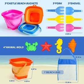 Brinquedos de praia dobráveis para crianças pequenas - [Brinquedos de praia para crianças de 3 a 10 anos] O conjunto de praia de brinquedo de areia inclui 3 baldes de praia de castelo, garfos de areia e pás de areia (cada 3), 4 moldes de praia coloridos de criaturas aquáticas e uma bolsa de praia de malha para armazenar todos os brinquedos de areia para crianças. - [Material seguro e durável] Feito de material de alta qualidade, o brinquedo de areia infantil é macio e seguro, e tem bordas lisas e design de superfície para facilitar a limpeza após o uso. - [Fácil de transportar e armazenar] O design de balde dobrável portátil e leve é adequado para as crianças aproveitarem o verão ao ar livre e viajarem na praia. Uma bolsa de praia de malha é suportada para conter todos os moldes de areia e é fácil sacudir a areia e a água. - [Castelo de brinquedo de areia criativo] Os brinquedos de castelo de areia dobráveis multicoloridos para conjuntos de praia incentivam as crianças a criar castelos diferentes e cultivar a capacidade e a imaginação das crianças. Além disso, você pode participar e aproveitar o divertido kit de brinquedos de areia traz. - [Lembranças divertidas de festa ao ar livre] Como um presente de aniversário de verão ou lembrancinhas de festa ao ar livre para brinquedos de areia para crianças. O kit de praia para brinquedos Sandbox pode ser utilizado no verão ao ar livre, como praia e natação, e também no dia a dia como armazenamento de contêineres.
