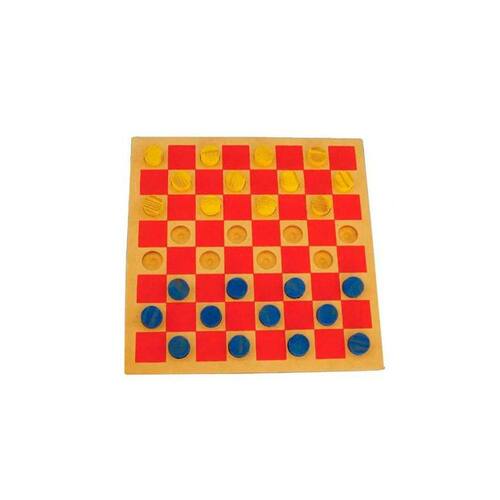 Tabuleiro confeccionado em MDF, medindo 200x200mm, contendo 24 peças em madeira