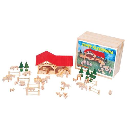 Conjunto confeccionado em madeira, contendo 45 peças de tamanhos diversos, variando de 280x150x140mm a 35x25x15mm, representando galpão, bonecos, animais, canil, cercados, árvores, carroça e trator. Propicia o conhecimento sobre o cotidiano da vida rural. Acondicionado em caixa de madeira.