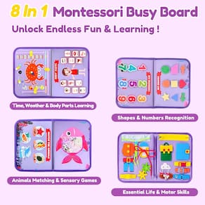 Descubra diversão e aprendizado com o Qizfun Busy Board, um brinquedo inspirado em Montessori repleto de mais de 20 atividades para aumentar a coordenação motora fina, resolução de problemas, coordenação olho-mão e prática de vestir. Este quadro sensorial de 8 páginas possui zíperes, botões, engrenagens, cadarços, relógios e muito mais, incentivando a exploração sem fim. Feito de feltro não tóxico com bordas arredondadas, é seguro para crianças e adequado para viagens de 28 x 23 cm com uma alça. Perfeito para viagens rodoviárias ou voos, este charmoso brinquedo com tema de sereia é um presente ideal para aniversários ou feriados, inspirando aprendizado alegre para crianças de 1 a 4 anos. - Habilidades em jogo: com mais de 20 atividades envolventes, nosso quadro ocupado ajuda as crianças a desenvolver habilidades essenciais, desde o controle motor fino e a resolução de problemas até a prática de vestir e a coordenação óculo-manual. Inclui zíperes, engrenagens, botões, cadarços, alfabeto, números, relógios e jogos sensoriais para um envolvimento sem fim. O design encantador de sereia adiciona um toque mágico, perfeito para meninas e o torna um brinquedo educativo essencial para crianças de 1 a 3 anos e crianças de 2 a 4 anos - Exploração inspirada em Montessori: Nosso livro ocupado para crianças é uma adição maravilhosa aos brinquedos Montessori, oferecendo 8 páginas envolventes inspiradas nos princípios Montessori. Repleto de atividades como cintos, botões, zíperes, cadarços, relógios, calendários, correspondência de formas, números, peixes sensoriais e muito mais, promove o crescimento cognitivo e habilidades essenciais para a vida. Uma mistura perfeita de aprendizagem e brincadeiras para ajudar seu filho a prosperar - Seguro e pronto para usar: Feito de feltro não tóxico, nosso quadro ocupado é projetado com crianças em mente. Com componentes maiores e bordas arredondadas, minimiza os riscos de asfixia e garante uma brincadeira segura. Com fechos de fecho aderente pré-instalados, não há necessidade de montagem - apenas um brinquedo sensorial seguro e conveniente para o seu pequeno - Compacto e divertido para viagens: projetado com uma alça e tamanho compacto (28 x 23 cm), este brinquedo educativo sensorial é essencial para viagens de crianças. Cabe facilmente em bolsas de fraldas ou mochilas, o que o torna perfeito para viagens rodoviárias ou viagens de avião. Mantenha seu bebê entretido e aprendendo em movimento com este companheiro de viagem envolvente - Presente perfeito para meninas: Procurando um presente especial para uma menina de 1, 2, 3 ou 4 anos? Com um design encantador de sereia, nosso quadro ocupado combina tecidos macios com atividades envolventes que promovem habilidades para a vida. Uma escolha ideal para aniversários, Natal ou qualquer ocasião, ou brinquedos divertidos de aprendizagem para crianças de 2 a 4 anos, é um brinquedo de aprendizagem pré-escolar pronto para usar que torna a educação divertida e alegre
