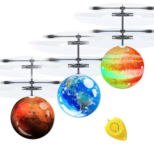 3 x Brinquedo voador --- Terra (azul), Lua (cinza), Marte (laranja)
