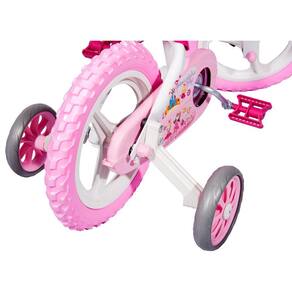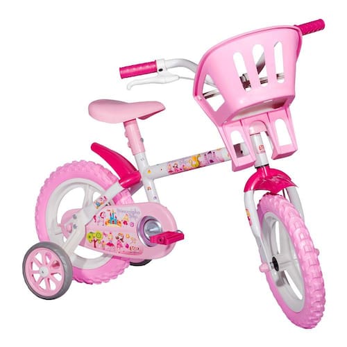 A bike é composta por quadro e garfos fabricados em aço carbono, manoplas e manete anatômicos, pneus em EVA, rodinhas auxiliares nas laterais, compartimento cobre corrente em plástico, uma linda cestinha para carregar pertences e estampas divertidas de Princesinhas que a garotada vai adorar.