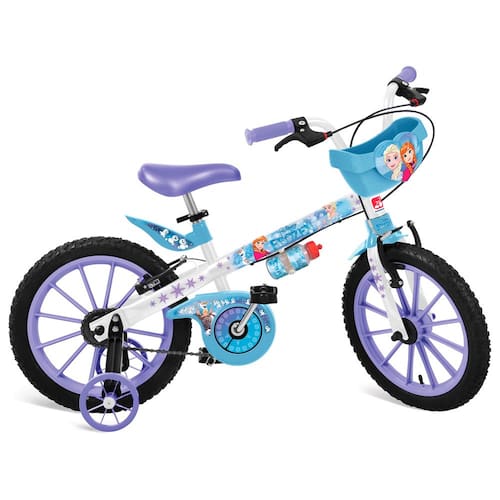Ela é confeccionada em aço carbono com encantadora decoração inspirada nos personagens da animação Frozen. Possui práticas rodinhas laterais removíveis que garantem a segurança dos pequenos durante o processo de aprendizagem.