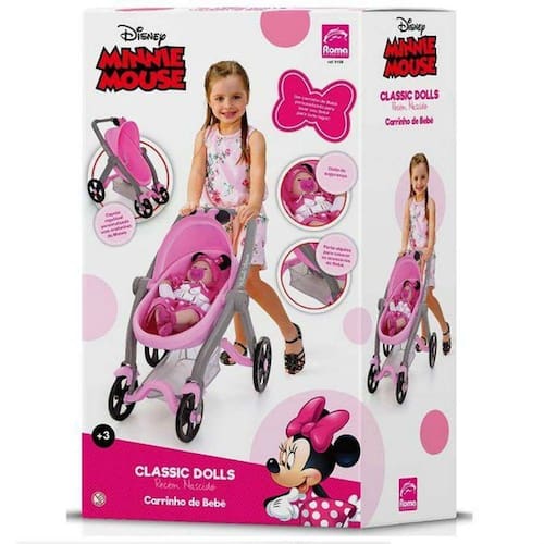 Carrinho De Bebe Classic Dolls Minnie Mouse eja uma verdadeira mamãe com este lindo carrinho para bonecas . gora você pode passear com suas bonecas para todos os lugares assim como a mamãe fez com você!