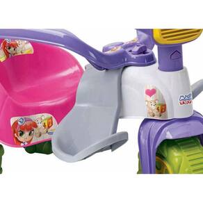 O Triciclo Infantil Tico Tico Zoom Meg Com Aro possui assento anatômico, haste direcionável para empurrar removível, suporte para os pés, aro de proteção removível e Rodas Grandes.