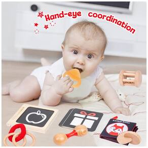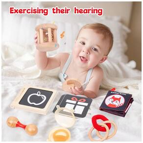 Kit de brincadeira Montessori para brinquedos para bebês de 3 a 4 meses O kit de brincadeira Montessori para bebês de 3 a 4 meses inclui sino pequeno, chocalho de madeira, brinquedo montessori, discos interligados, cartão preto e branco, brinquedos de mordedor e livro de pano para bebê.