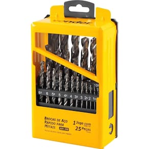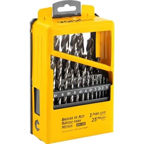 1 Jogo de brocas de aço rápido DIN 338, sendo: 1 broca de 1,0 mm, 1 broca de 1,5 mm, 1 broca de 2,0 mm, 1 broca de 2,5 mm, 1 broca de 3,0 mm, 1 broca de 3,5 mm, 1 broca de 4,0 mm, 1 broca de 4,5 mm, 1 broca de 5,0 mm, 1 broca de 5,5 mm, 1 broca de 6,0 mm, 1 broca de 6,5 mm, 1 broca de 7,0 mm, 1 broca de 7,5 mm, 1 broca de 8,0 mm, 1 broca de 8,5 mm, 1 broca de 9,0 mm, 1 broca de 9,5 mm, 1 broca de 10,0 mm, 1 broca de 10,5 mm, 1 broca de 11,0 mm, 1 broca de 11,5 mm, 1 broca de 12,0 mm, 1 broca de 12,5 mm e 1 broca de 13,0 mm.