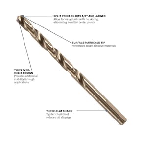 BOSCH CO2159B Broca de metal cobalto M42 1 peça 1/2 pol. x 15 pol. com haste três planas para aplicações de perfuração em aço inoxidável, ferro fundido, titânio, metal de calibre leve, alumínio - Broca de cobalto M42 – oferece brocas de comprimento de trabalho de cobalto M42 atualizadas projetadas para durabilidade, alta resistência ao calor e superfície endurecida para aço inoxidável, ferro fundido, titânio, metal de calibre leve e alumínio - Material de liga M42 aprimorado – contém 8% de liga de cobalto que proporciona 10x de vida útil em comparação com brocas padrão - Pontas resistentes ao calor – suportam aplicações de alta temperatura por longos períodos de tempo - Design espesso de hélice de teia – oferece estabilidade adicional em aplicações difíceis - Ponta endurecida na superfície – penetra em materiais abrasivos resistentes - Pontos divididos nas pontas de 1/8 pol. e maior – permite um começo fácil sem patinação, eliminando a necessidade de um perfurador central - Haste de três pontas planas de 3/40.6 cm. e maior – proporciona melhor aderência da broca