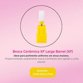 A broca ideal para profissionais que fazem alongamentos de unhas em todas as técnicas, com corte extra fino para unhas a, XF Large Barrel XF é uma broca de cerâmica com granulação extra fina, ideal para acabamento e polimento suave em unhas com alongamento em gel, acrílico ou polygel. Seu corpo largo e cilíndrico proporciona uma área de contato maior, permitindo um lixamento uniforme e controlado, especialmente nas fases finais do procedimento. Por ser de cerâmica, oferece excelente dissipação de calor, evitando desconforto durante o uso contínuo. É perfeita para profissionais que buscam resultados delicados, com um toque de precisão e segurança no acabamento da estrutura.