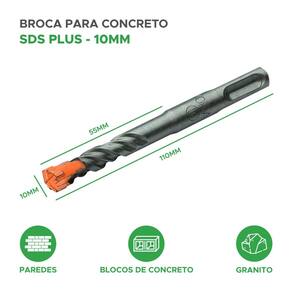Utilizada para perfurar concreto e materiais semelhantes. Ela tem um sistema de encaixe chamado sds-plus que possibilita a troca rápida de brocas. Essas brocas têm uma ponta feita de aço endurecido para perfurar eficazmente o material, e o tamanho dela é 10mm de diâmetro com um comprimento total de 110mm.