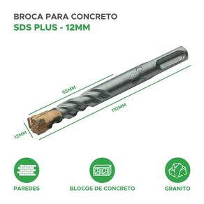 Utilizada para perfurar concreto e materiais semelhantes. Ela tem um sistema de encaixe chamado sds-plus que possibilita a troca rápida de brocas. Essas brocas têm uma ponta feita de aço endurecido para perfurar eficazmente o material, e o tamanho dela é 12mm de diâmetro com um comprimento total de 110mm.