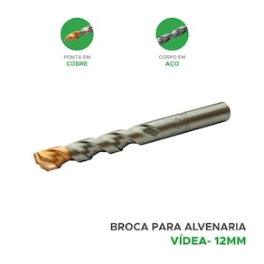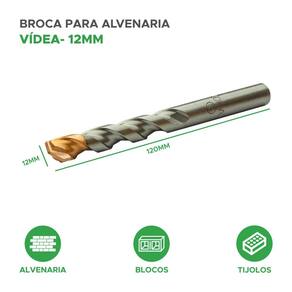 O tamanho da broca é caracterizado pelo diâmetro de 12mm e um comprimento total de 120mm. Essa broca é utilizada em projetos de construção e reforma para criar furos precisos em superfícies de alvenaria, permitindo a fixação de objetos ou a passagem de cabos e tubos.