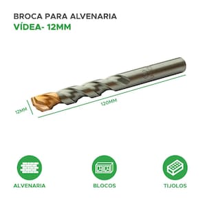 O tamanho da broca é caracterizado pelo diâmetro de 12mm e um comprimento total de 120mm. Essa broca é utilizada em projetos de construção e reforma para criar furos precisos em superfícies de alvenaria, permitindo a fixação de objetos ou a passagem de cabos e tubos.