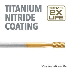 Dremel Max Life Broca de entalhe rotativa de alto desempenho 194HP 1/8" (3,2 mm), pacote com 2 - Dremel A linha de acessórios de alto desempenho Max Life oferece desempenho duradouro e durabilidade impressionante. Construído para dar a você acessórios versáteis de maior duração, desempenho mais forte. - A broca de entalhe Max Life 194HP é revestida com nitreto de titânio e é projetada para durar 2 vezes mais do que a broca de entalhe padrão Dremel 194 não revestida. - As brocas de entalhe funcionam bem para remoção detalhada de material em aplicações como modelagem, entalhe, gravação, vazamento, corte de precisão, ranhuras, ranhuras, incrustações, fazer furos cônicos ou roteamento à mão livre. - A forma cilíndrica da broca de entalhe permite a remoção profunda do material, corta áreas planas, bordas arredondadas e faz cortes de parada e cortes em V. A ponta do acessório faz ranhuras e ranhuras de fundo plano, cortes laterais planos e faz cortes em V quando mantida a 45 graus. - Diâmetro operacional: 1/8" (3,2 mm), Haste: 1/20.3 cm, (3,2 mm), Material: Aço de alta velocidade com revestimento de nitreto de titânio